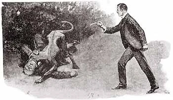 Watson ratuje Rucastle’a przed jego mastiffem (ilustracja z „The Strand Magazine”)