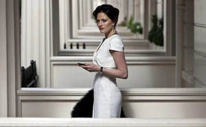 Irene Adler is a tall Englishwoman in her twenties/thirties. She wears her dark hair in a vintage inspired updo, and dons bright red lipstick. She is seen wearing skintight black and white dresses.
